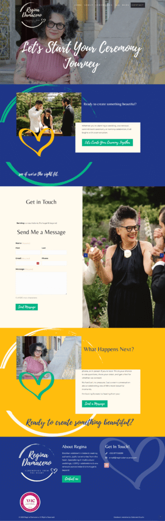 When designing Regina’s website, we focused on capturing her warmth, expressive personality and global outlook. The result is a vibrant, inviting space that reflects her storytelling approach and her ability to create ceremonies that feel both joyful and deeply meaningful.